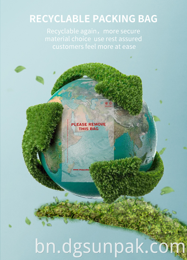 * পলিব্যাগ হল 30% বা 50% বা 70% পুনর্ব্যবহারযোগ্য উপাদানের মিশ্রণ, বাকি নতুন উপাদান, 100% পুনর্ব্যবহৃত মানে সমস্ত উপাদান পুনর্ব্যবহারযোগ্য উপাদান, LDPE、HDPE、PPE、CPE、PP বিকল্প হতে পারে।